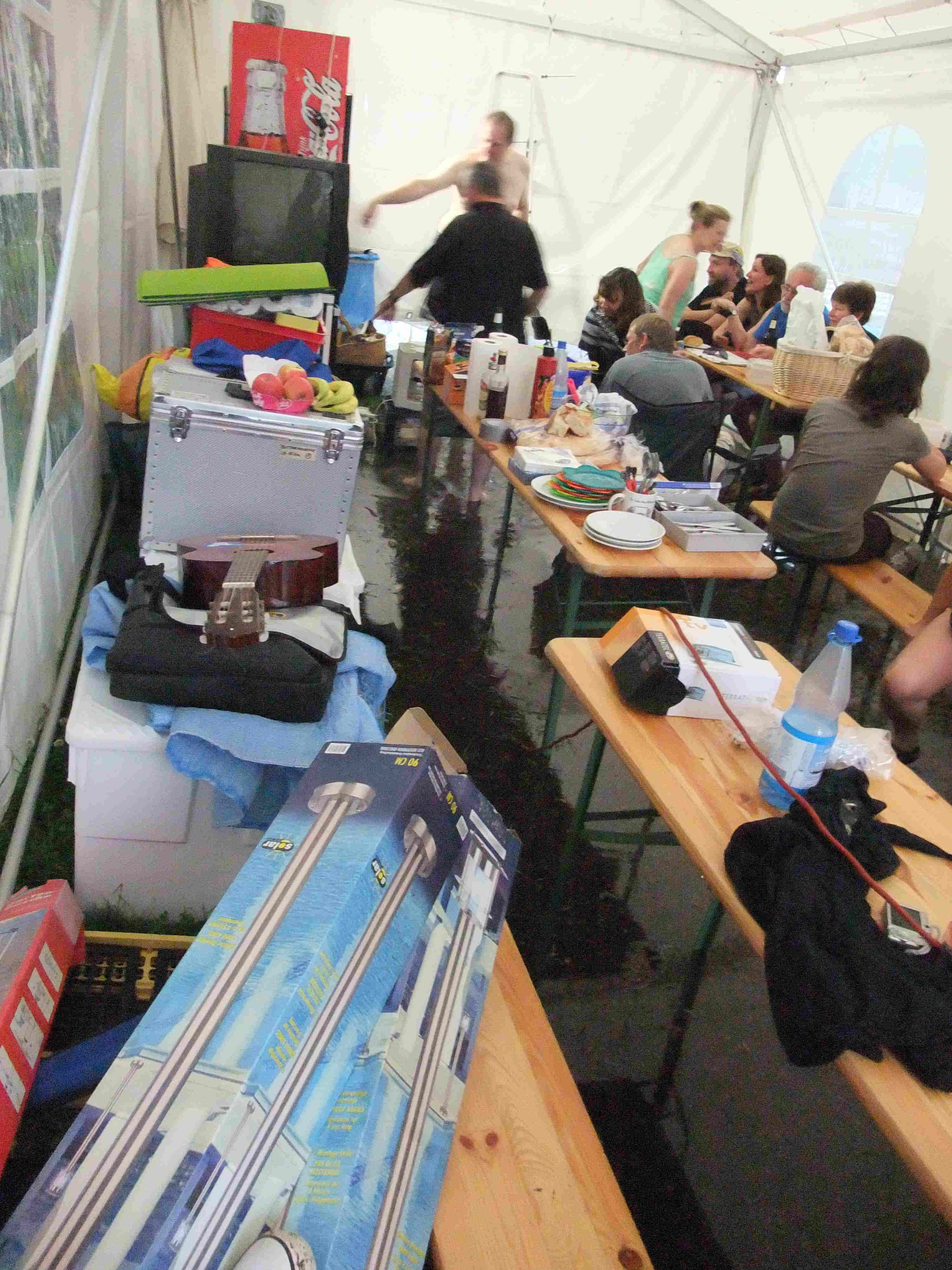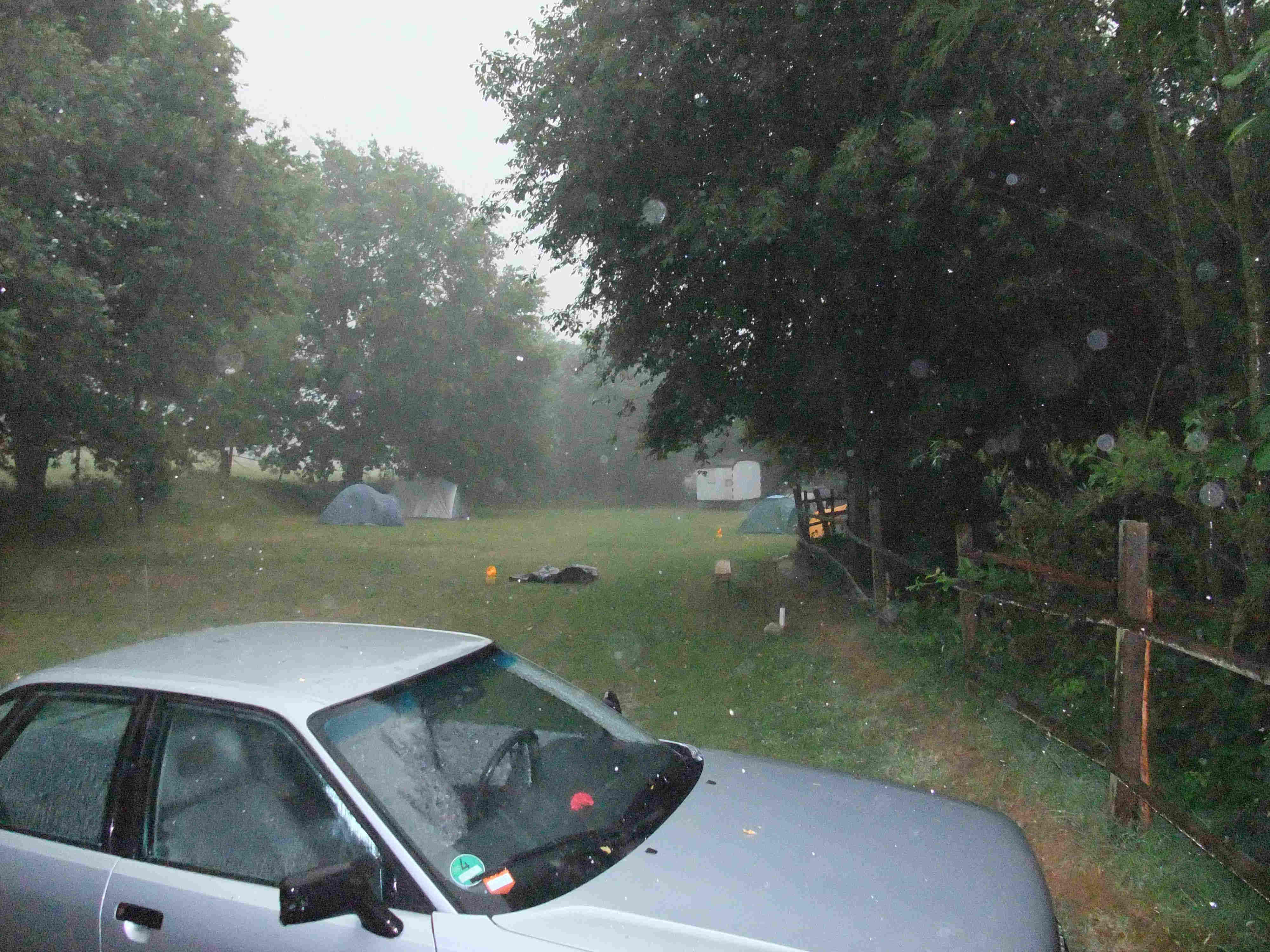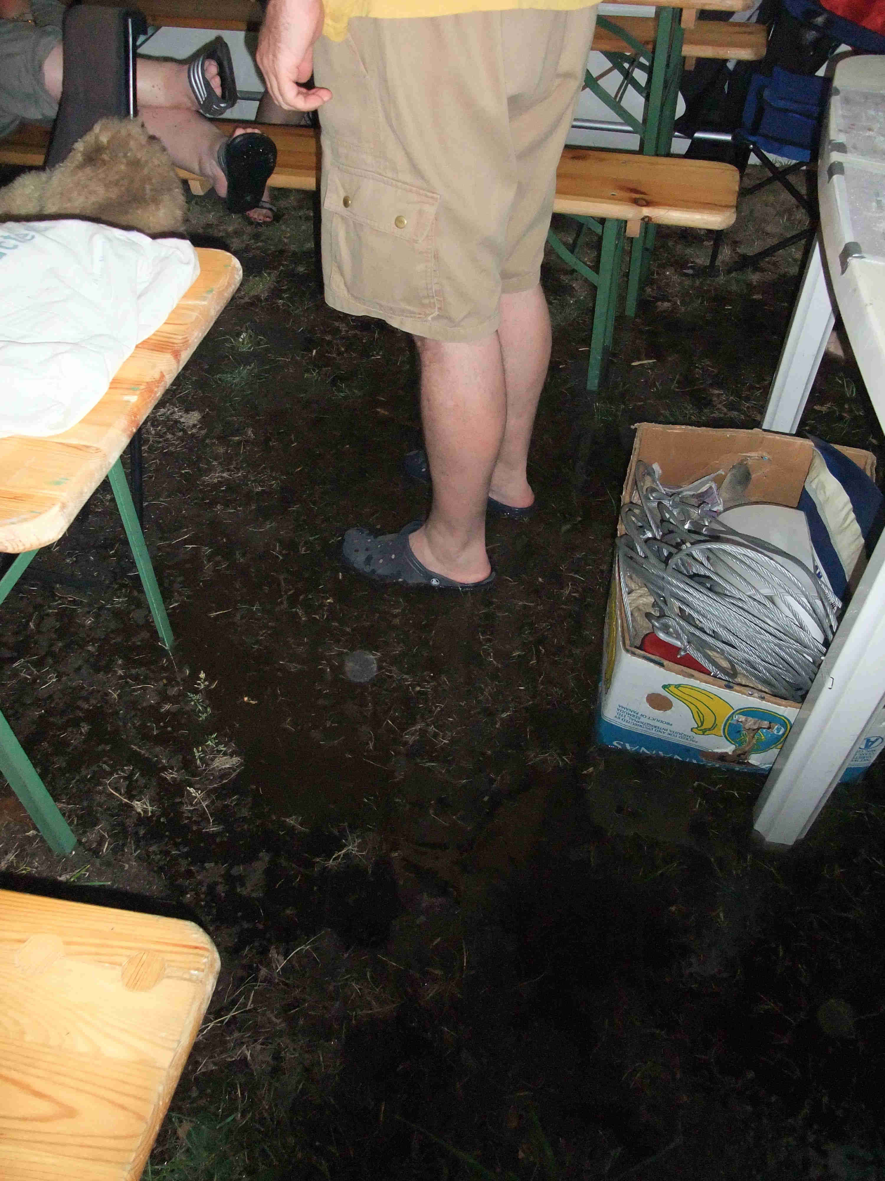 Unter Heikos Anleitung (der mit dem Megefon) nimmt das ganze Gestalt an Abendliches Kulturprogramm beginnender Regen auch Starkregen genannt So ne' Art Naturdusche Das Wasser steigt im Zelt ...und steigt... Wichtig: Regelmäßige Wasserstandsmeldungen ...und von innen Zum Glück gibt's Abflüsse Die übliche Lagerfeuerromantik Der Platz in der Sonne.... Einige Gäste Schon besser Zeltaufbau Aufsicht