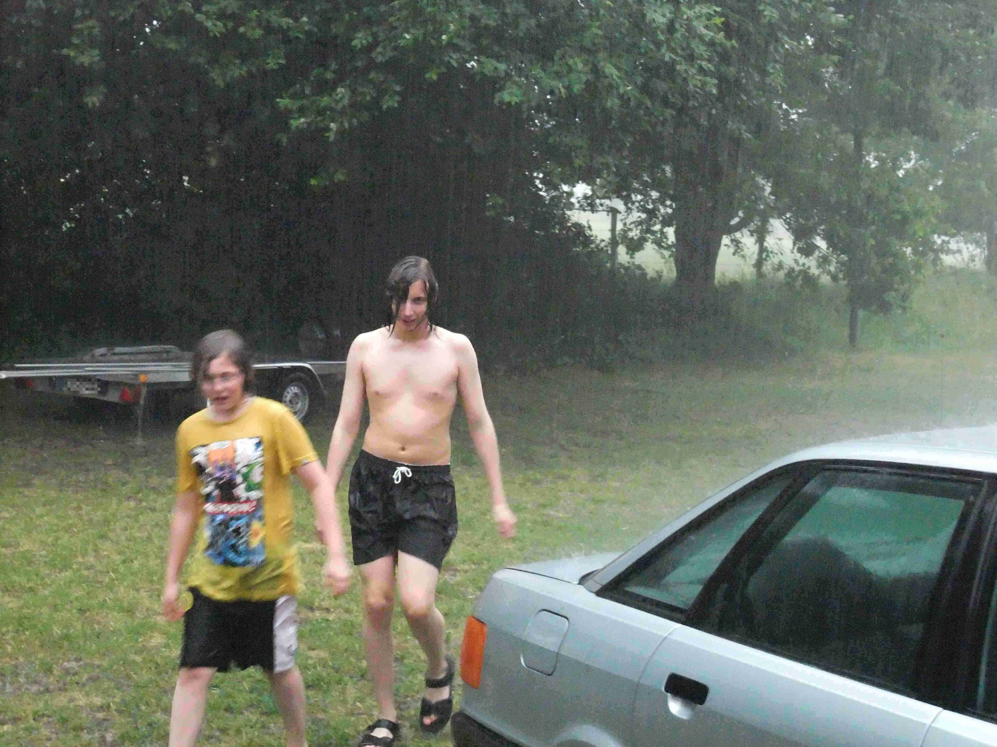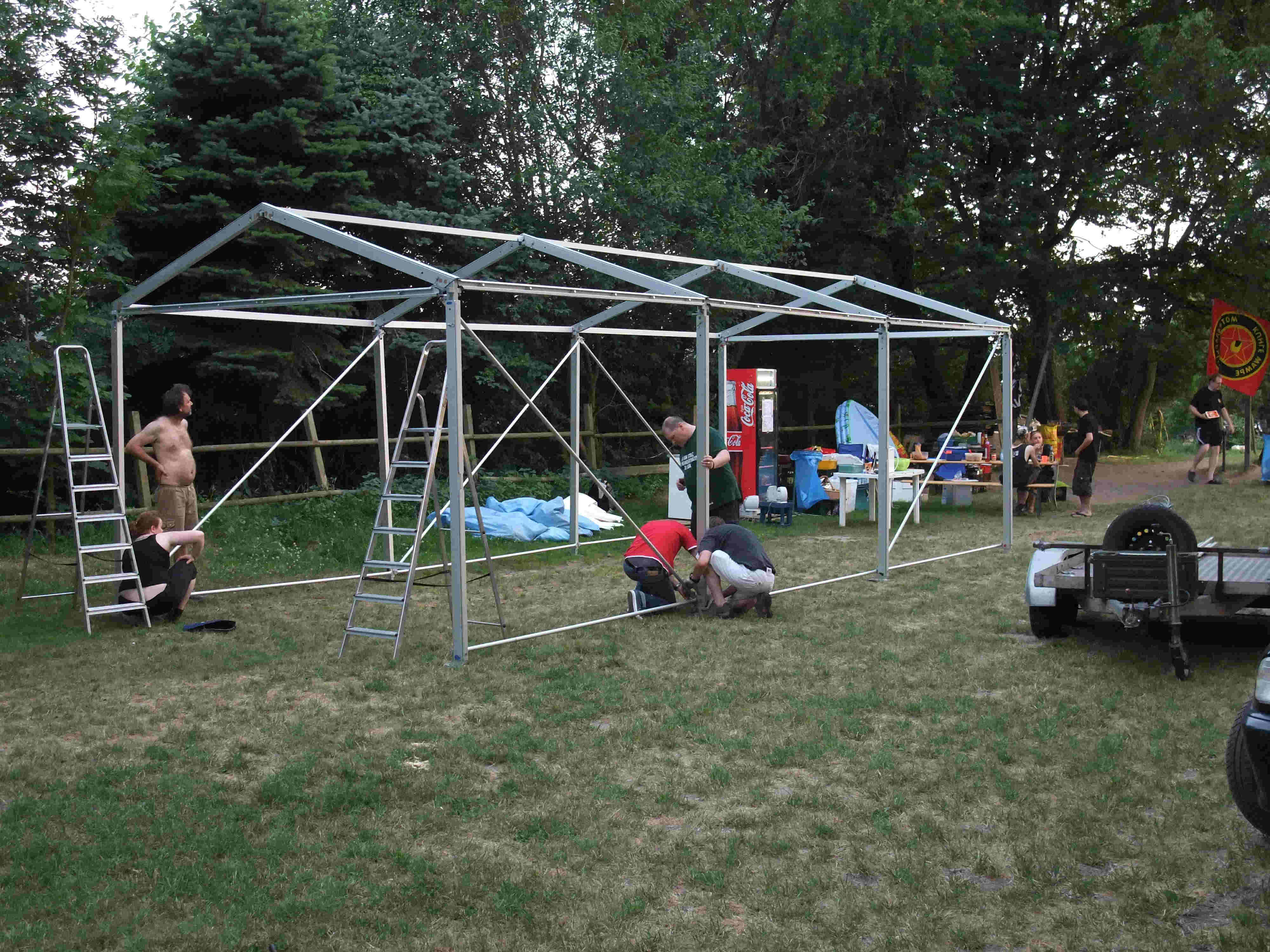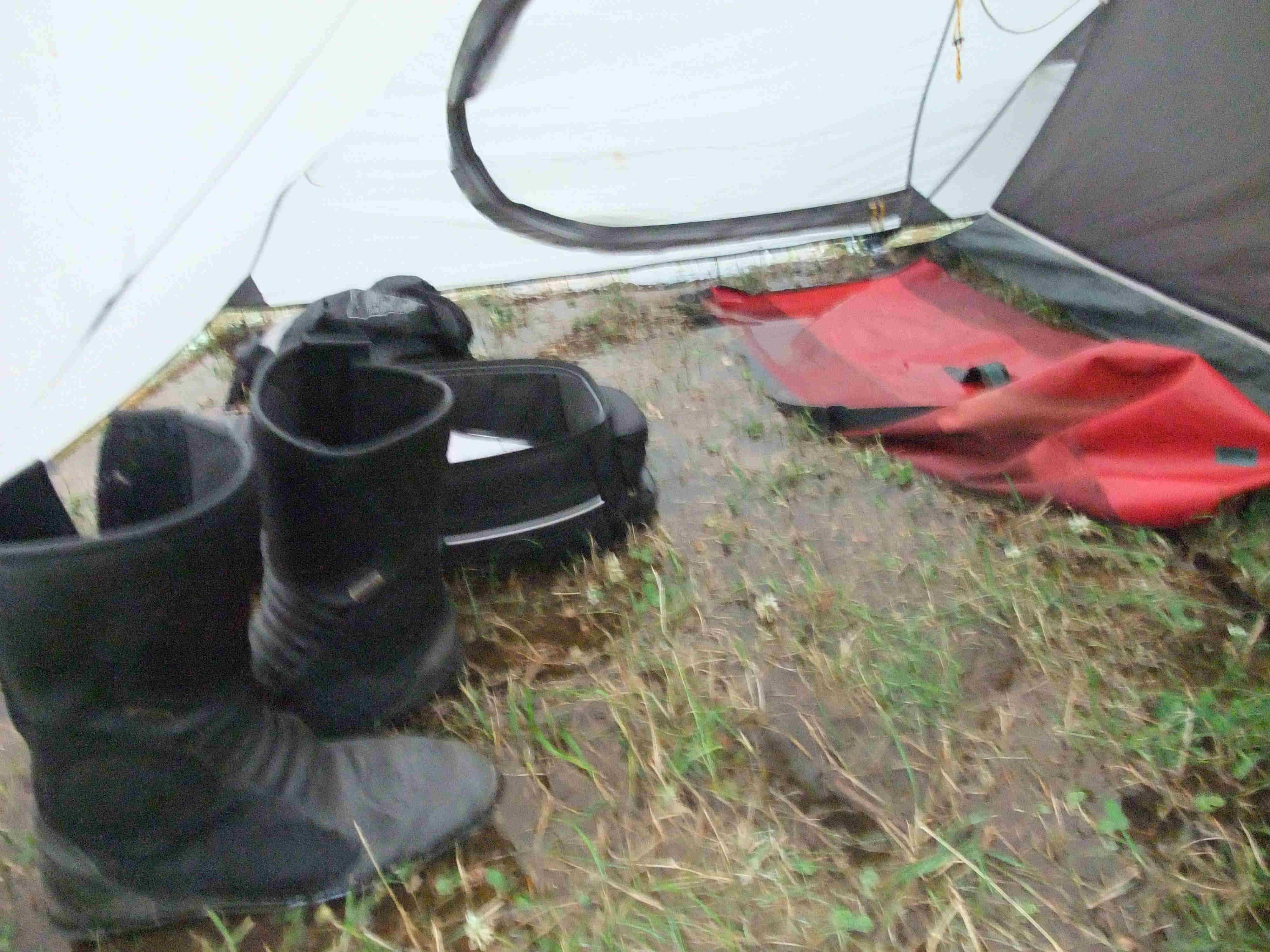 Unter Heikos Anleitung (der mit dem Megefon) nimmt das ganze Gestalt an Abendliches Kulturprogramm beginnender Regen auch Starkregen genannt So ne' Art Naturdusche Das Wasser steigt im Zelt ...und steigt... Wichtig: Regelmäßige Wasserstandsmeldungen ...und von innen Zum Glück gibt's Abflüsse Die übliche Lagerfeuerromantik Der Platz in der Sonne.... Einige Gäste Schon besser Zeltaufbau Aufsicht