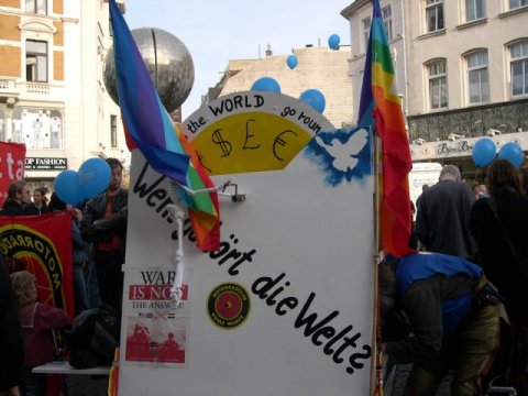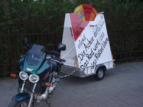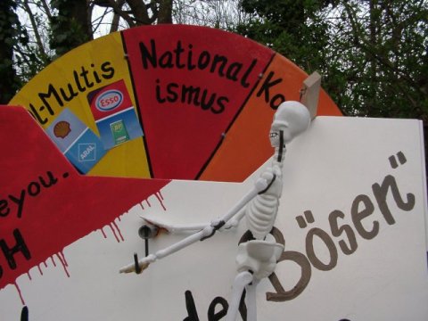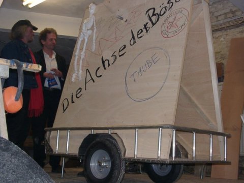 der Rohbau Maßnehmen im Maßanzug der erste Bauabschnitt Richtfest das umzugsfertige Gefährt George Troubleyou Bush bei der Arbeit ... und das alles mit TÜV(-Plakette) Einsatz am Kugelbrunnen... ... zwei Sätze Lustballons für einen guten Zweck Die Ostermarsch Rein/Raus 2003 Bärlin