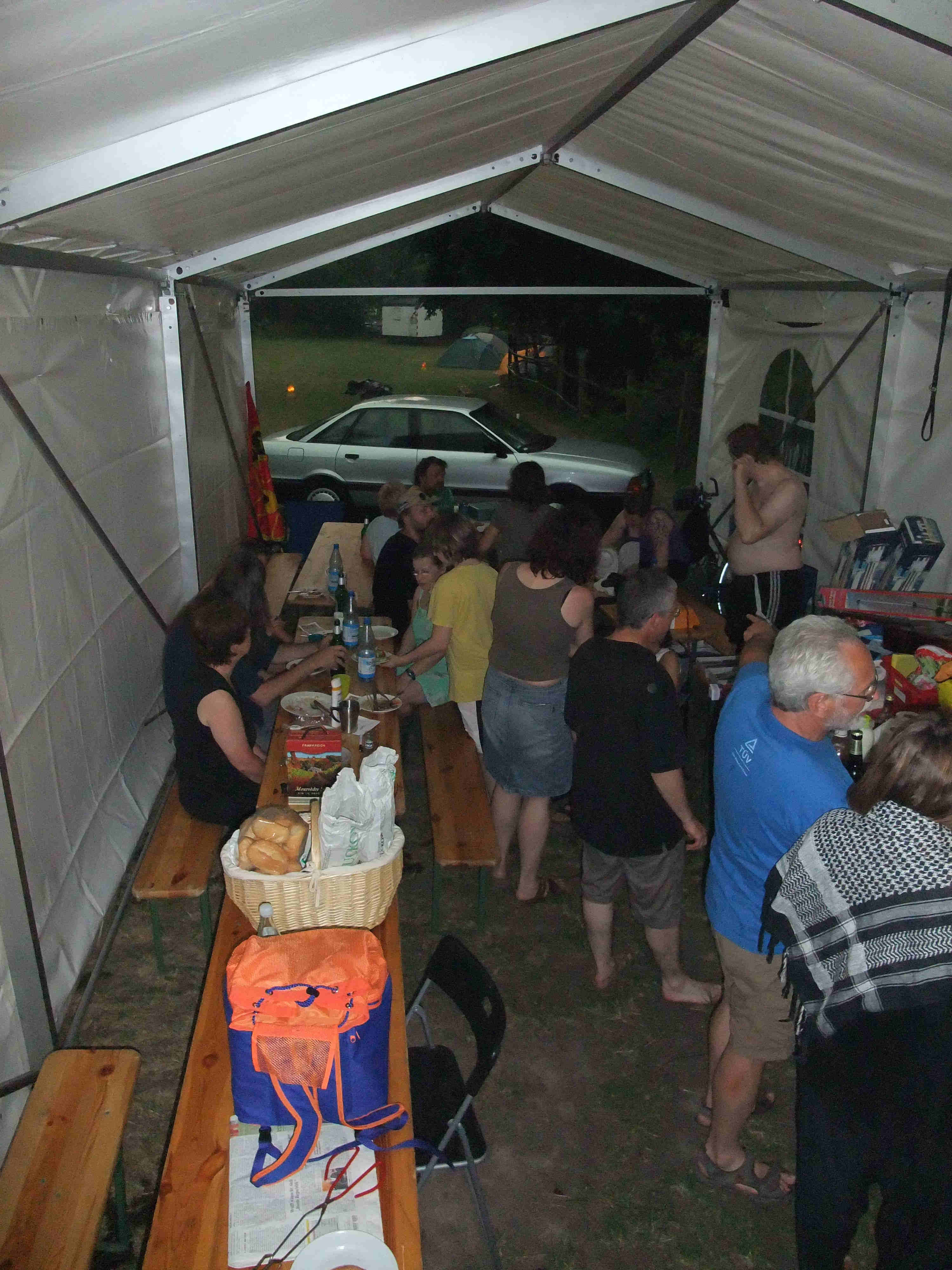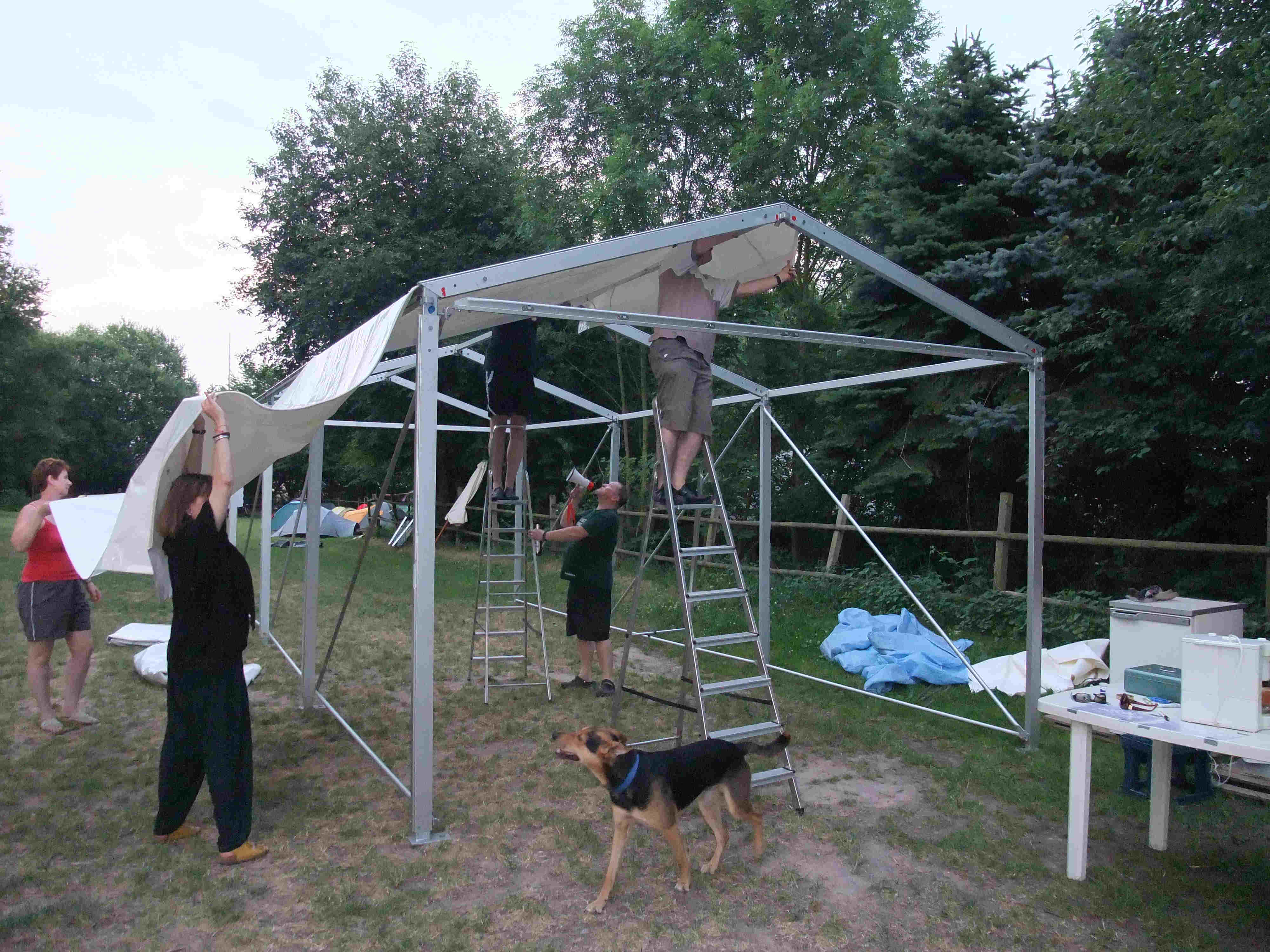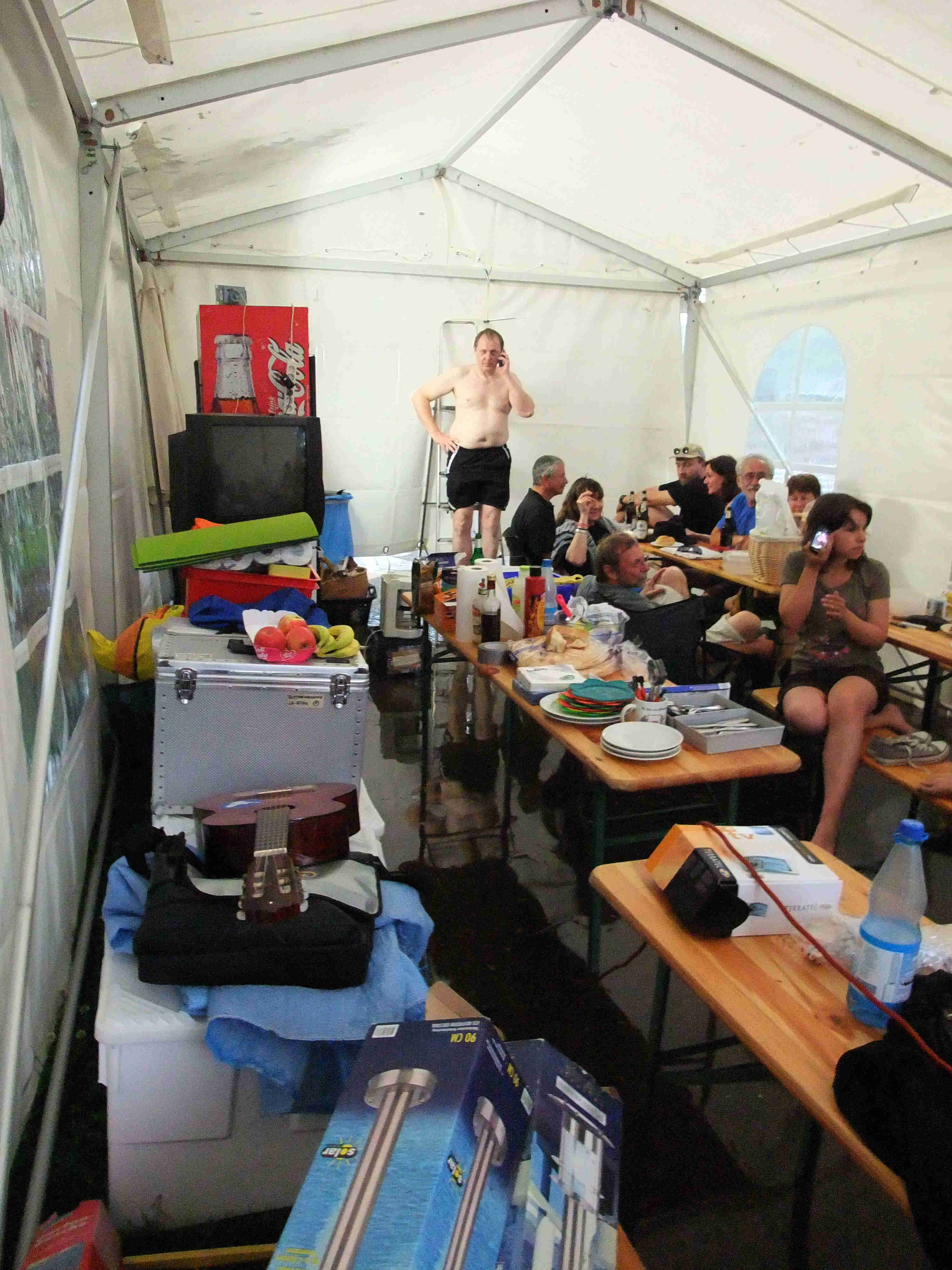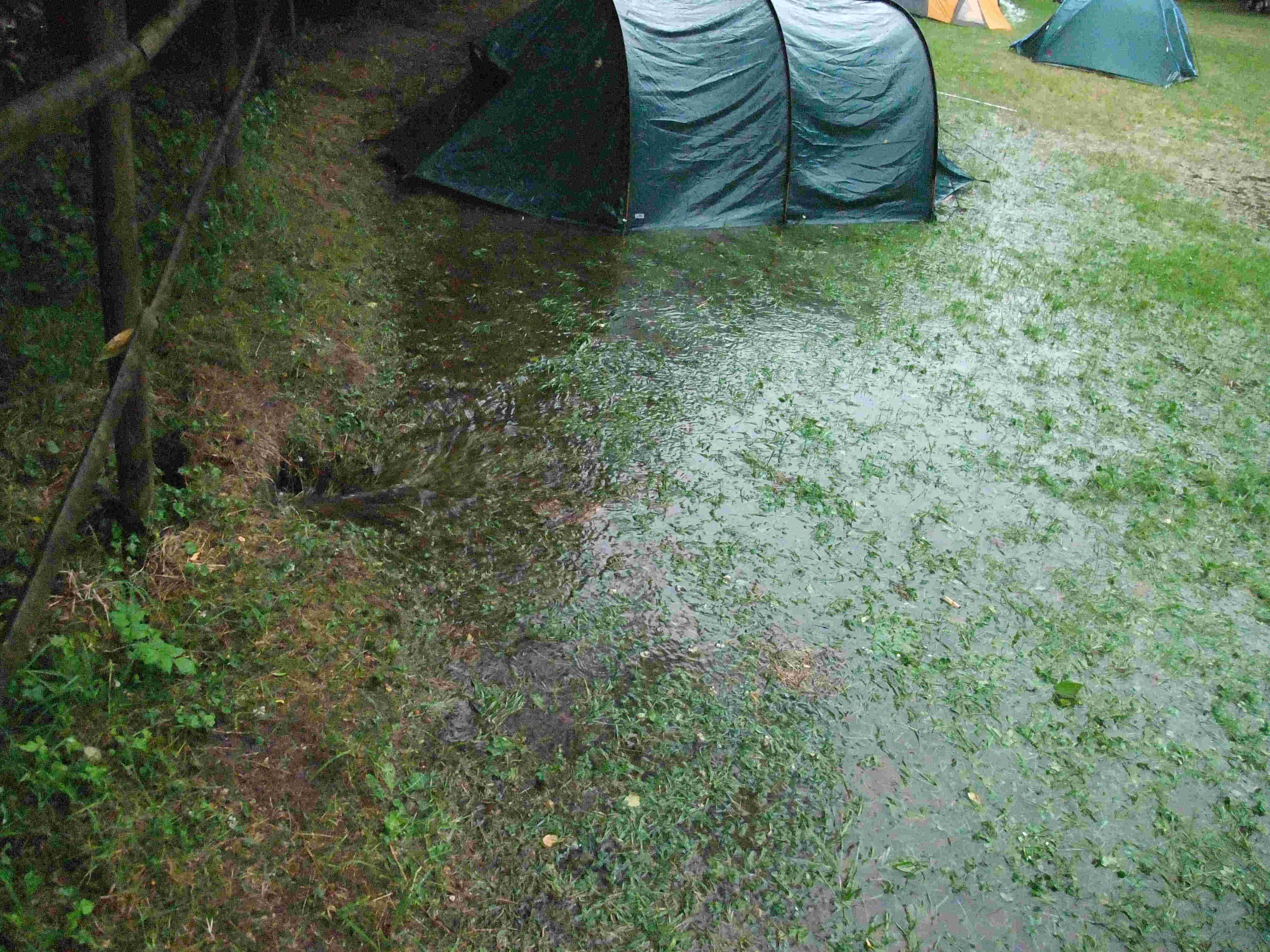 Unter Heikos Anleitung (der mit dem Megefon) nimmt das ganze Gestalt an Abendliches Kulturprogramm beginnender Regen auch Starkregen genannt So ne' Art Naturdusche Das Wasser steigt im Zelt ...und steigt... Wichtig: Regelmäßige Wasserstandsmeldungen ...und von innen Zum Glück gibt's Abflüsse Die übliche Lagerfeuerromantik Der Platz in der Sonne.... Einige Gäste Schon besser Zeltaufbau Aufsicht