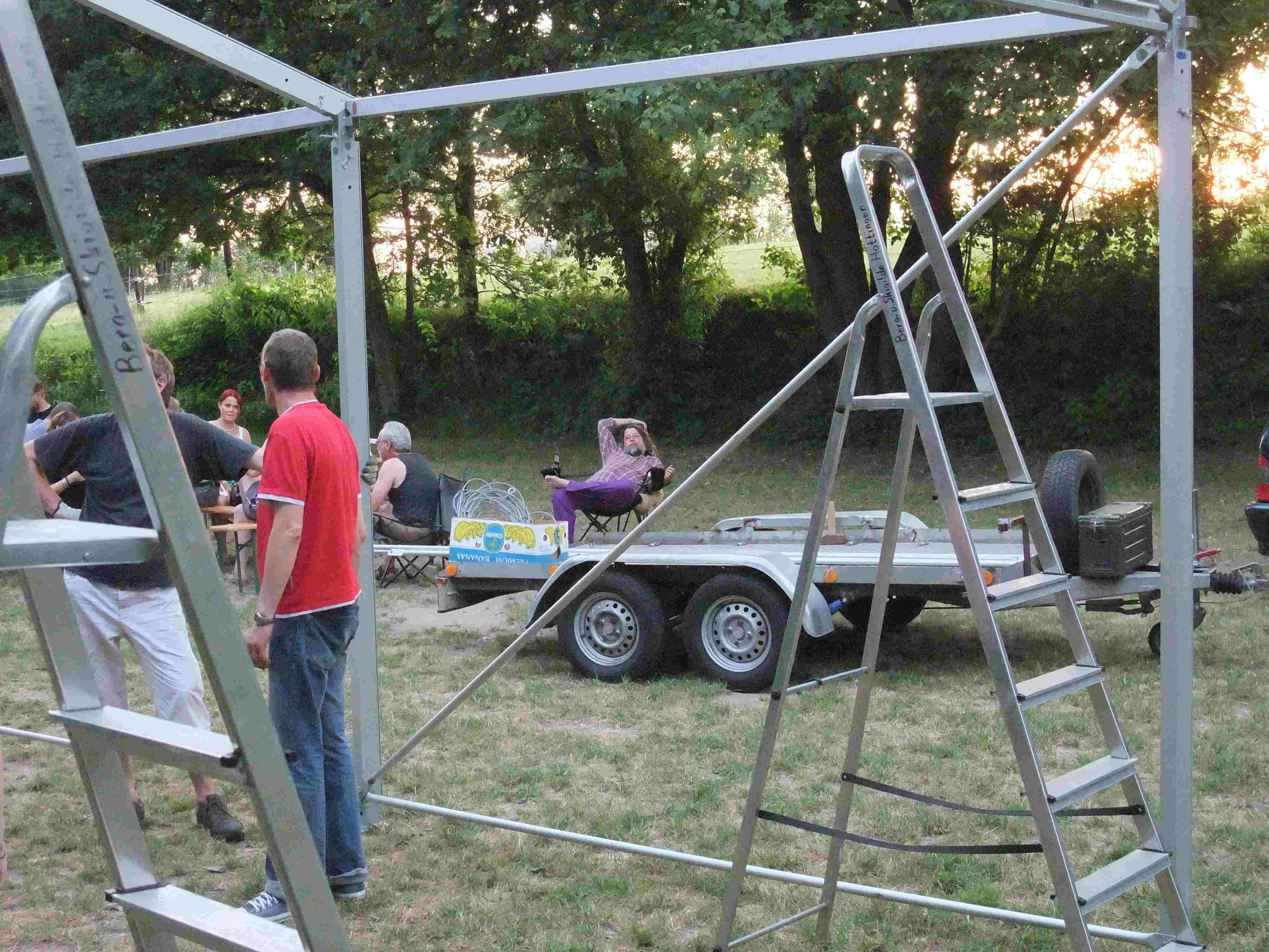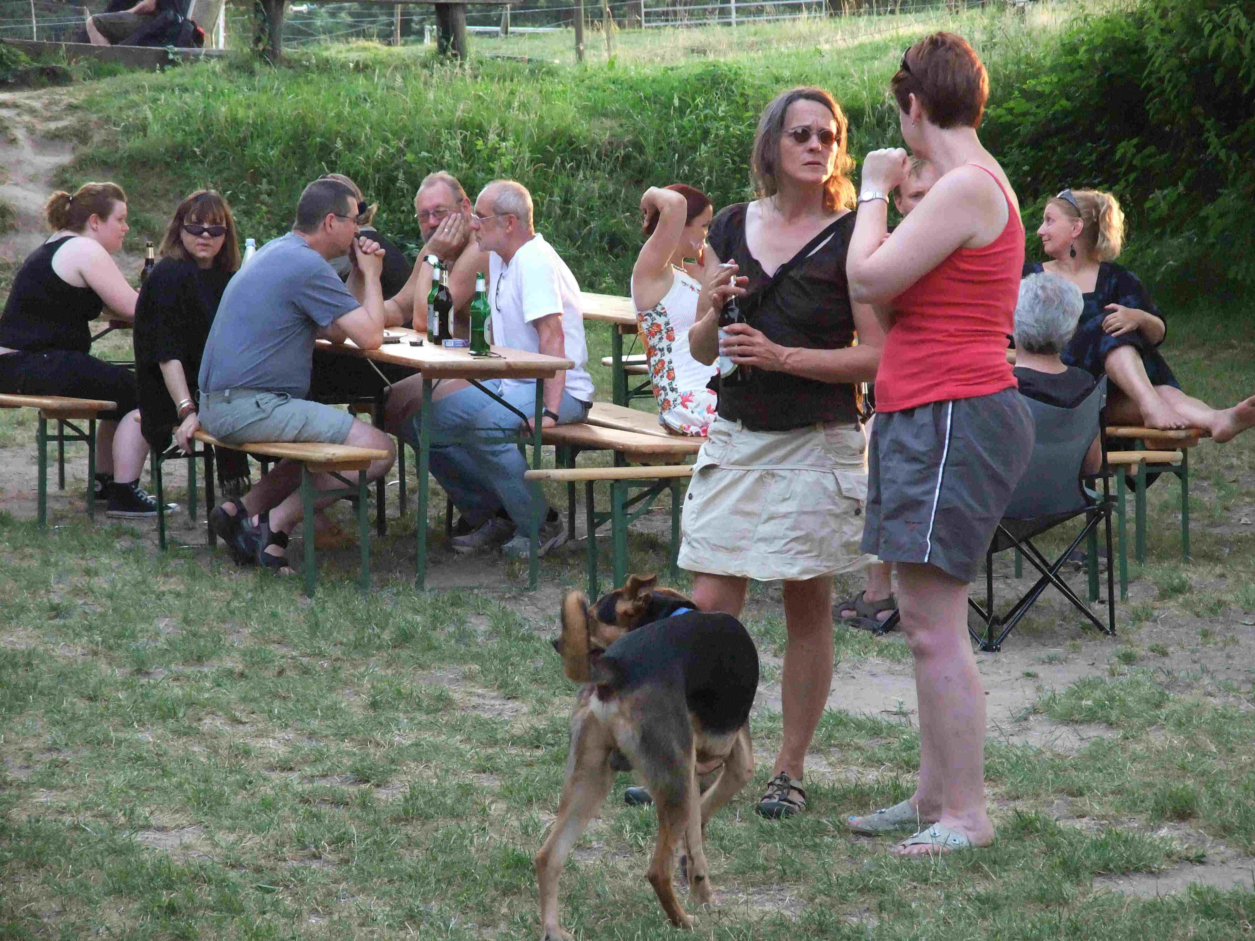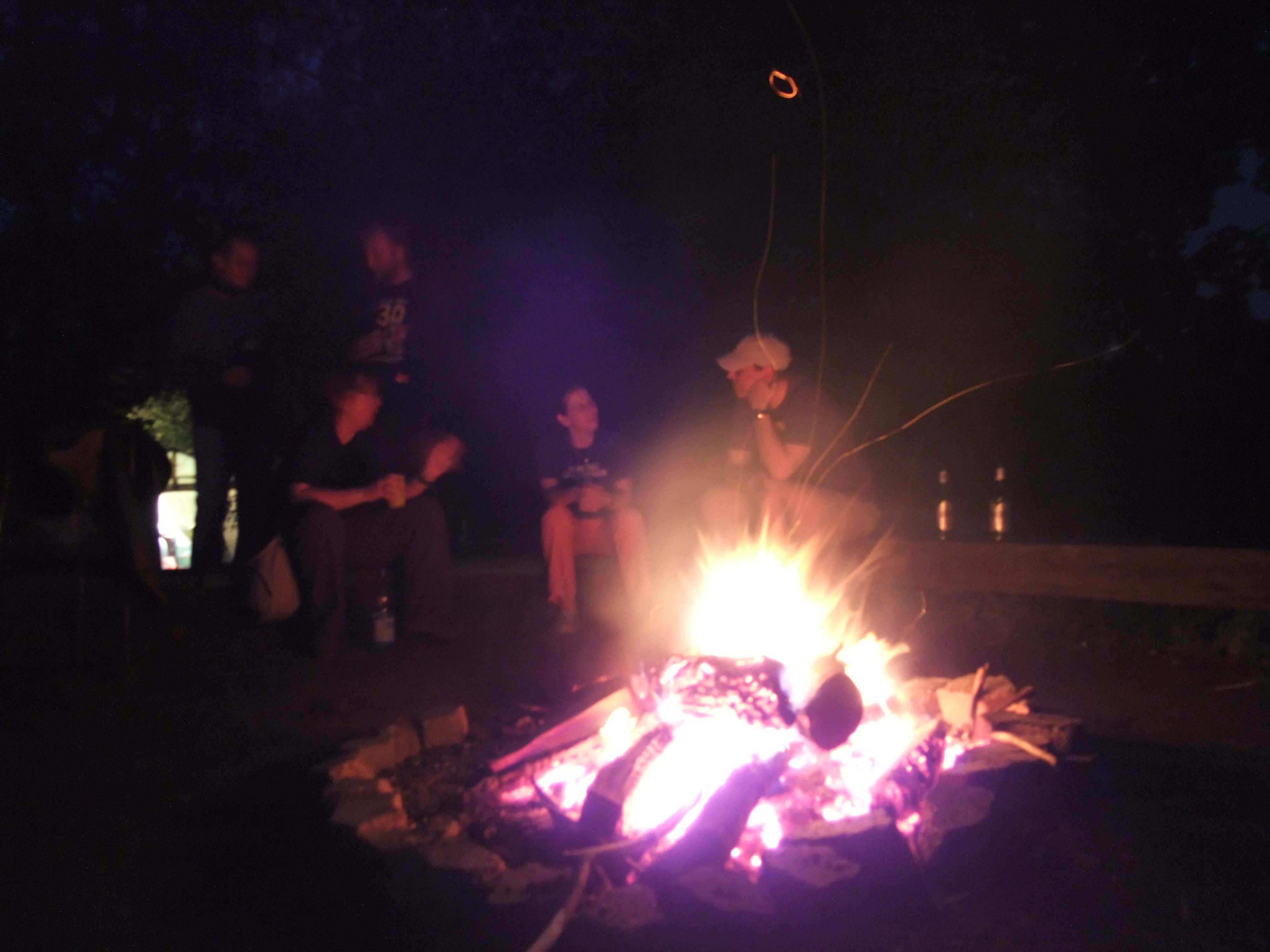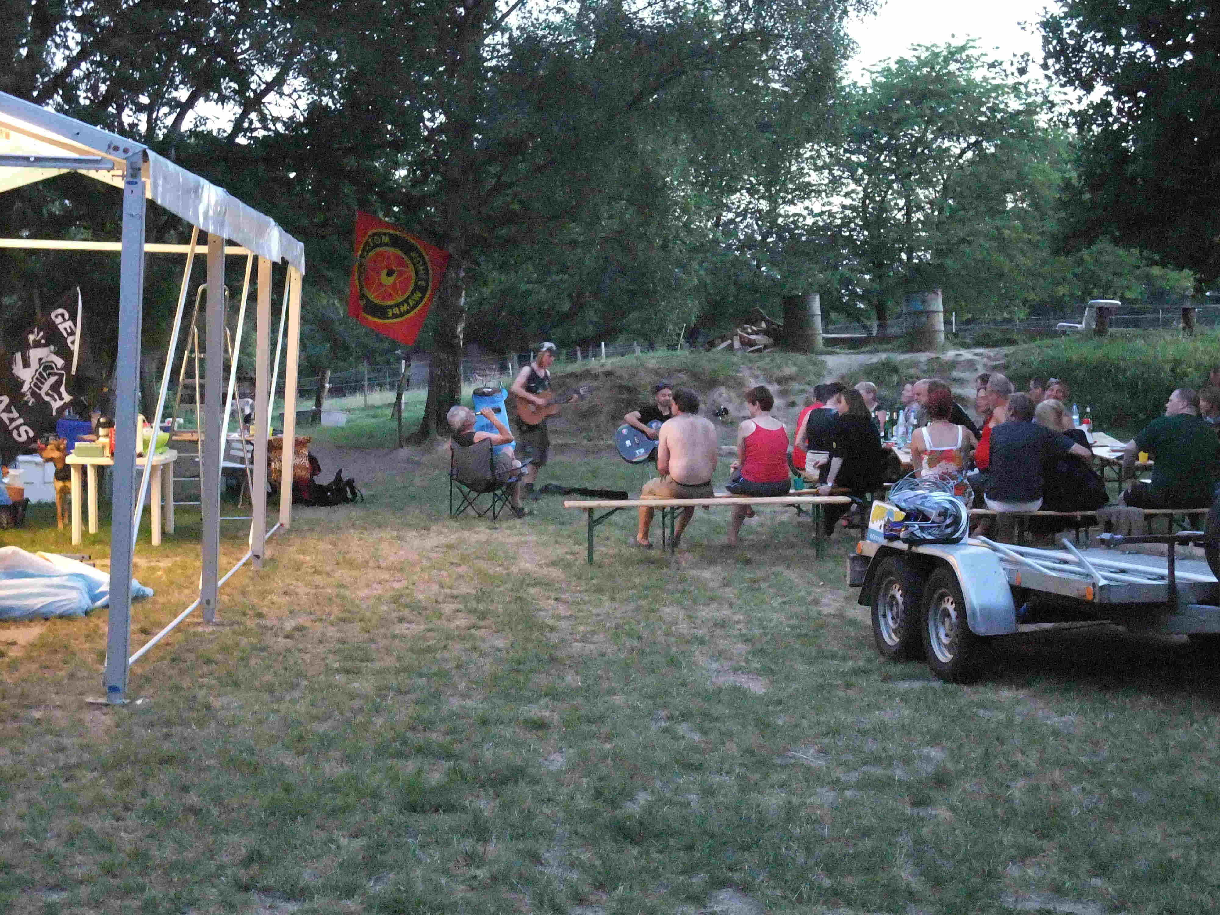 Unter Heikos Anleitung (der mit dem Megefon) nimmt das ganze Gestalt an Abendliches Kulturprogramm beginnender Regen auch Starkregen genannt So ne' Art Naturdusche Das Wasser steigt im Zelt ...und steigt... Wichtig: Regelmäßige Wasserstandsmeldungen ...und von innen Zum Glück gibt's Abflüsse Die übliche Lagerfeuerromantik Der Platz in der Sonne.... Einige Gäste Schon besser Zeltaufbau Aufsicht